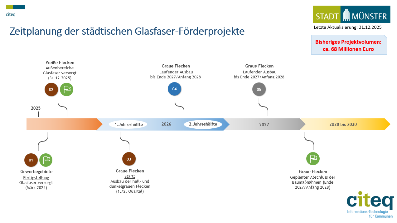 Die Breitbandstrategie der Stadt Münster orientiert sich am Ziel der Bundesregierung, dass bis zum Jahr 2030 alle Münsteraner Haushalte mit Übertragungsraten von mindestens ein Gbit/s versorgt sein sollen. Erreicht wird dieses Ziel unter der Voraussetzung entsprechender Förderprogramme über folgende Maßnahmen:
